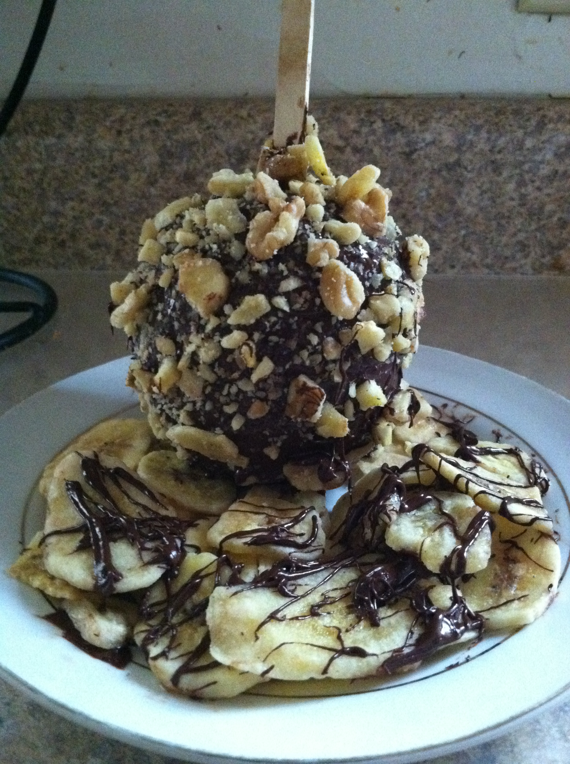 Half Dozen Milk Chocolate Coated Apples topped with Crushed Walnuts and dried Bananas