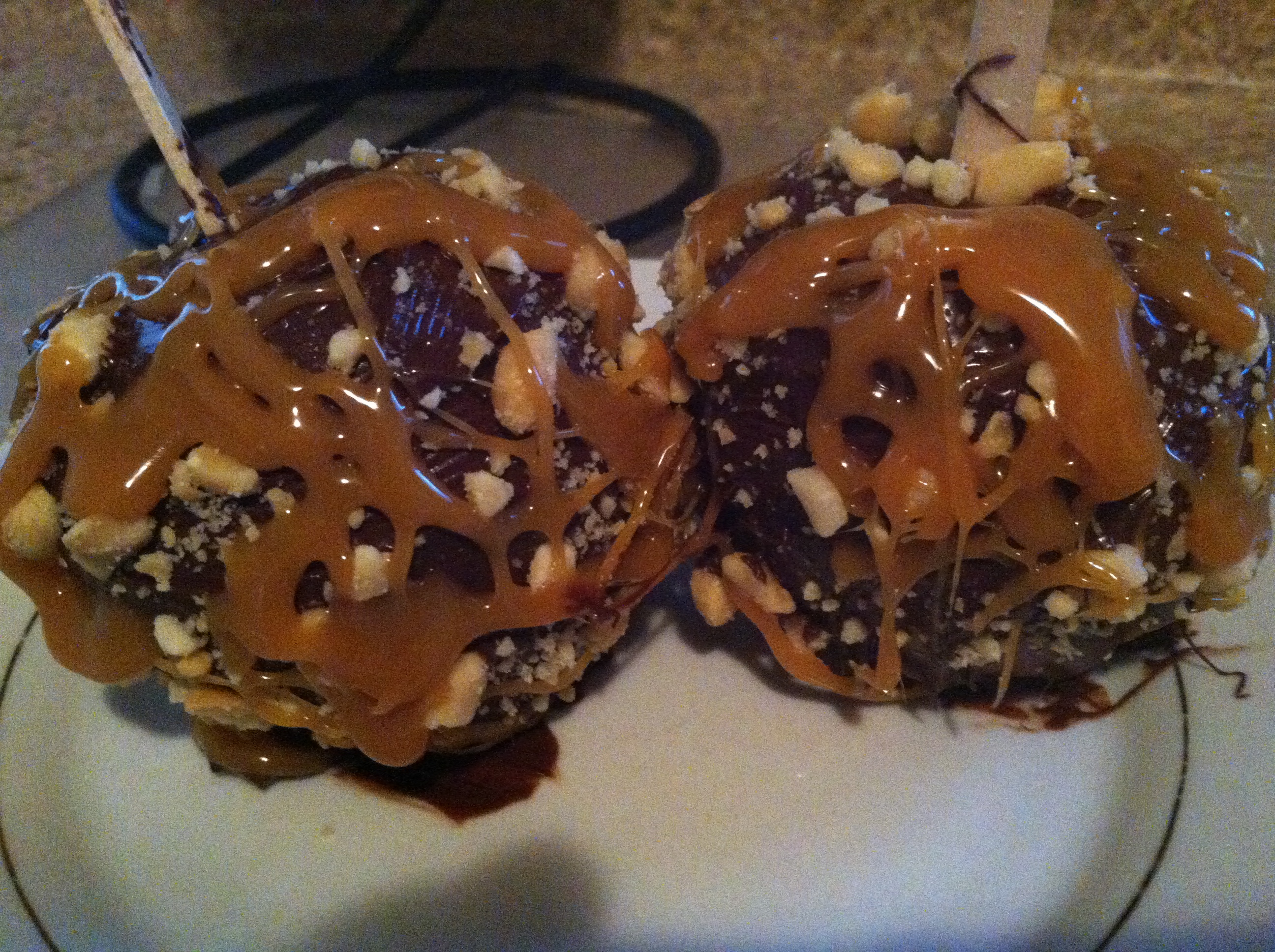 Half Dozen Chocolate covered apples topped with peanuts and drizzled with caramel (pictured in mini size)