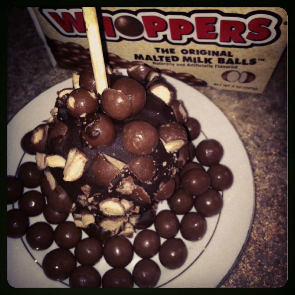 Half Dozen Chocolate covered apples topped with chocolate covered malt balls