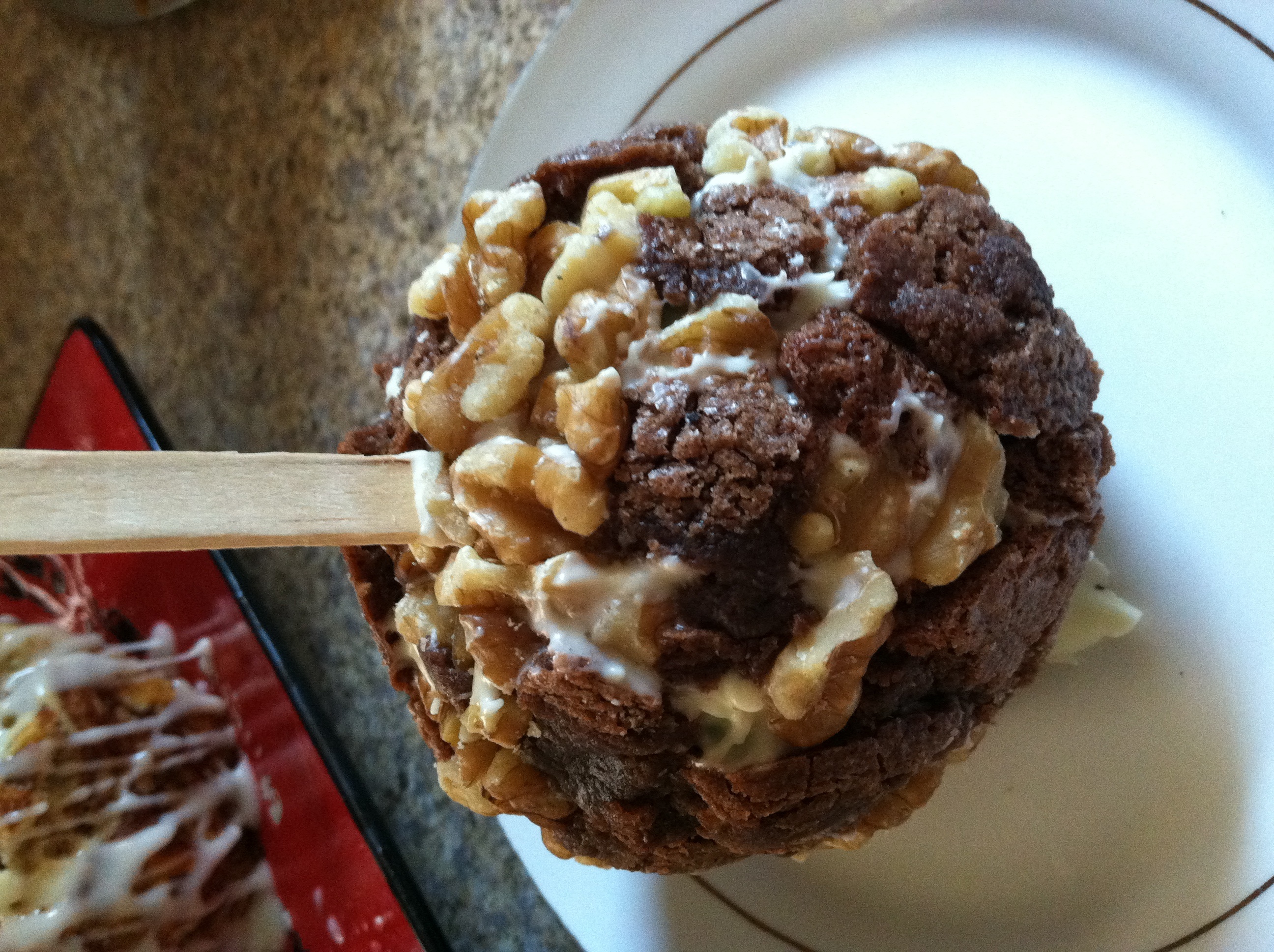 half dozen apples dipped in white chocolate wrapped in a soft baked brownie wit walnuts to seal the deal.